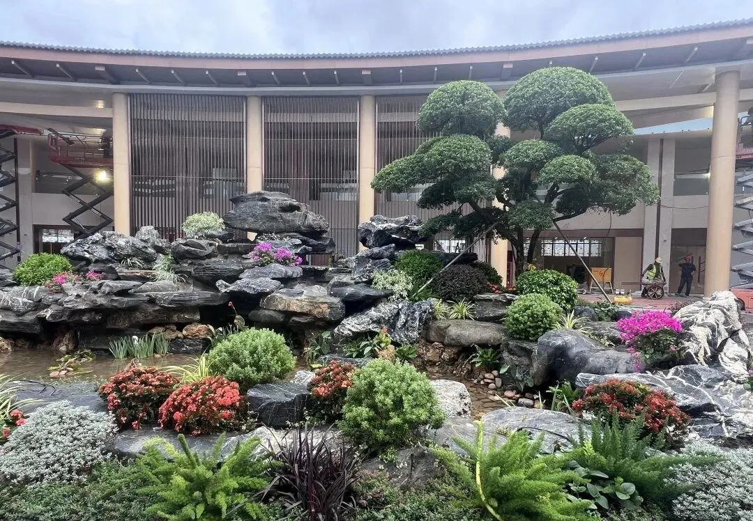 国庆中秋假期,热水服务区正式以 “交通+文化”的新姿态开门迎客。服务楼外立面改造以客家围龙屋为设计灵感,在保留原有环形布局的基础上,融合大理石、铝合金格栅与铝镁锰板屋面等现代材料,展现层次分明、主次有序的建筑美感。服务区的中庭区域以室内园林形式呈现,自然光与仿木格栅、内庭圆柱相映成趣,中庭园林里的绿植、水景与天井景观交织,营造出客家聚落般“移步换景”的观感,构建出静谧雅致的文化休憩场所。
